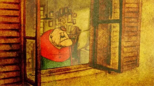 老爷爷照旧过着自己的日子,红酒,烟斗,一条鱼。有天,水位上涨到门口,他不得不以继续加盖房子,无论风吹雨打。房子盖好,他驶船回去取东西时,一个摇晃,烟斗掉入了水里。老爷爷回去后始终感觉少了什么,翻出旧的烟斗却找不到合适的,发现了潜水服,于是他整装待发,下水取烟斗。下水,潜水,一气呵成,看到了烟斗,而当他拾起烟斗时,回忆如同水流般涌入脑海。