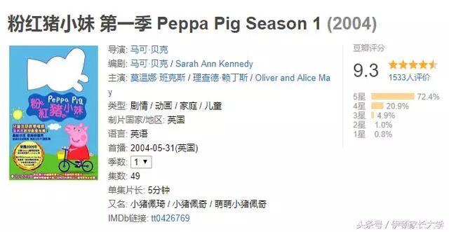 这部动画片从2004年首映至今已经拥有全球数亿粉丝,不仅小孩子喜欢,成年人也钟爱。尤其在中国,小猪佩奇系列的豆瓣评分一直高居9.0以上: