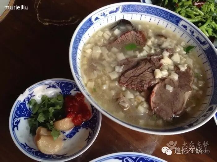 看着同桌的人都戴上手套边聊天边细细的掰着馍,心想这啥时候能掰完?性急的我三下五除二就掰好了,请服务员拿到后厨去浇汤。服务员看了看说“女士,这馍呀,要掰成均匀小指甲盖大小的才好吃。大师傅在添汤加肉时可是会看谁用了心,均匀小块的师傅给加的料(牛羊肉)也多。您再把大块的掰下吧!”说完又把碗放回我面前。啊?一个羊肉泡还有这么多讲究。看看邻座的几个女同事,的确比我搿的细碎均匀,无奈只能返工慢慢的掰。终于二十几个大碗送到后厨,翘首等待的滋味颇有上学时等待考试成绩的忐忑不安。当大碗再次被摆在面前,我碗里的肉的确比邻座的姐姐少了几块,汤也没那么多 。哎,谁让自己没耐心呢?料虽比不过别人,但味道绝对一流,干硬的馍吸满了鲜香的汤汁,真是吃上一口少吃几餐饭都可以,再佐以青翠小菜更是连满汉全席都可以不要。