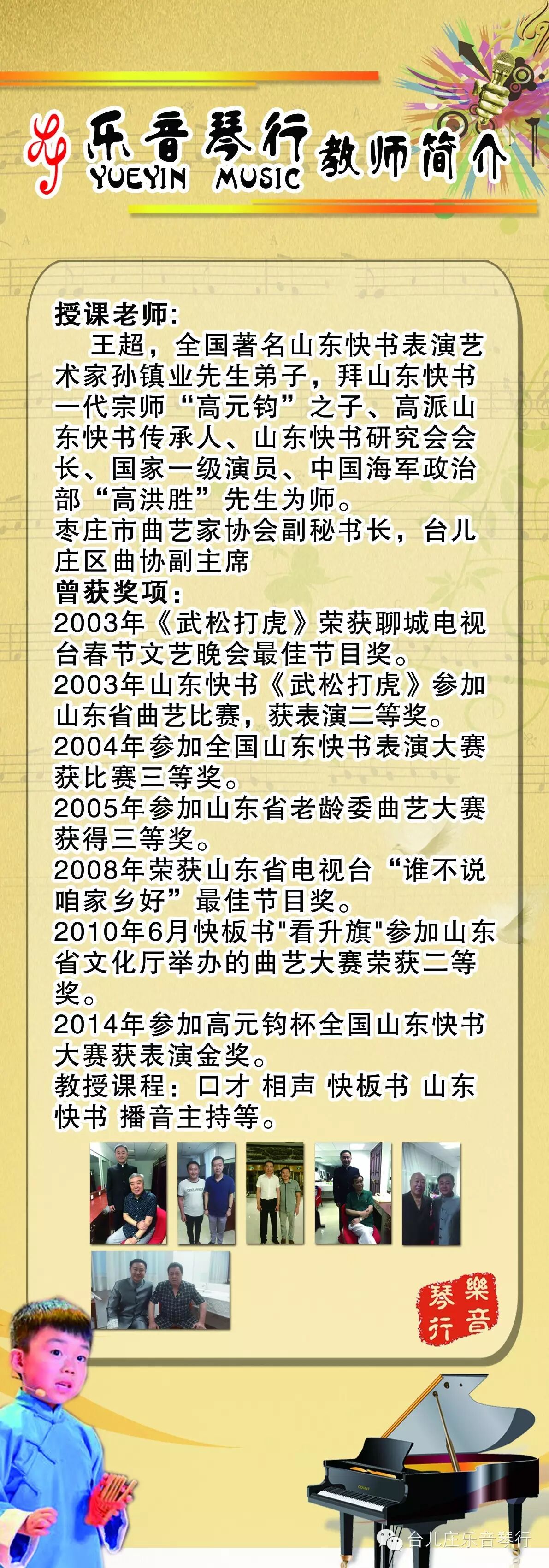 教师简介:张全 ,江苏师范大学教师,硕士研究生学历,有十余年音乐教学经验,辅导中考、高考学生近千人考取大学本科。邓永超,毕业于曲阜师范大学音乐学院,进修于上海音乐学院,师从于王曙光教授、宿清忠教授研习美声唱法。师从于刘炳臣教授、刘英教授研习唢呐、葫芦丝等民族管乐器。曾与吕薇、牛群、刘兰芳、姜昆同台演出,并受到艺术家的一致好评!王超,全国著名山东快书表演艺术家孙镇业先生弟子,拜山东快书一代宗师“高元钧”之子、高派山东快书传承人、山东快书研究会会长、国家一级演员、中国海军“高洪胜”先生为师。2014年参加高元钧杯全国山东快书大赛获表演金奖。2015年在济南举办的首届泉城书会,全国优秀曲艺传人学术交流展演获金奖。