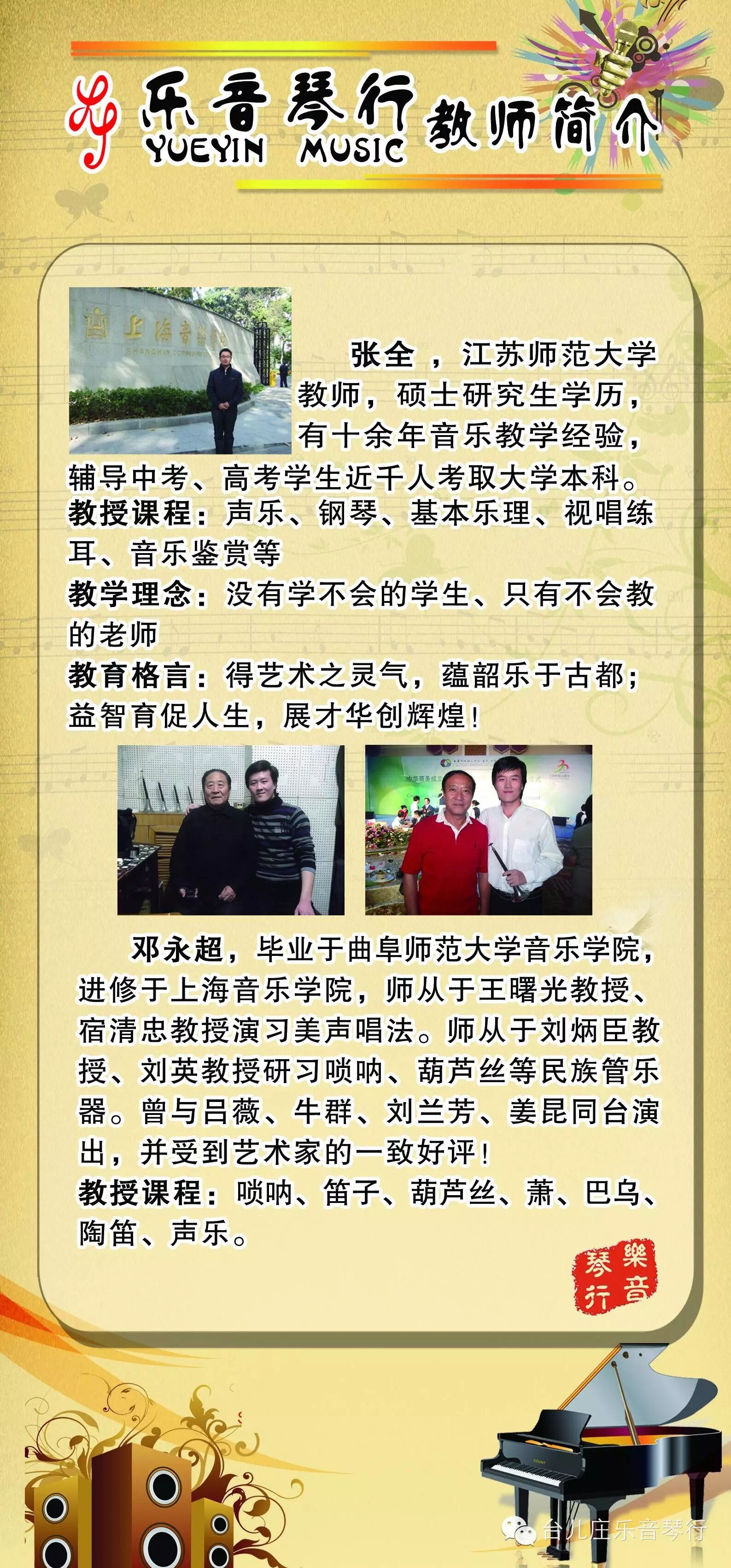 琴行所有任课教师均毕业于专业艺术院校,具有扎实的专业功底和丰富的教学经验。本琴行是中国音乐学院指定考级培训单位、山东艺术学院生源培训基地、山东大学艺术学院生源培训基地、江苏师范大学教学实践基地、枣庄市音乐家协会理事单位。艺术顾问、客座教授:山东艺术学院声乐教研室主任李保珍教授、山东大学艺术学院院长李晓峰教授、山东师范大学舞蹈教研室主任岳音教授、枣庄学院音乐学院院长李永教授。