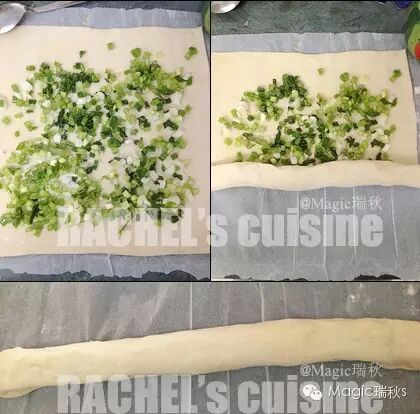 2、撒葱花,卷起酥皮,然后,可将长条状酥皮稍微拉伸一下;(酥皮在室温中软化,有延展性,很好拉伸)