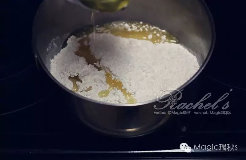 2、取30克热葱油,倒入面粉中,搅拌一下;