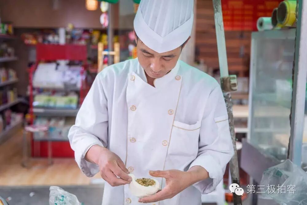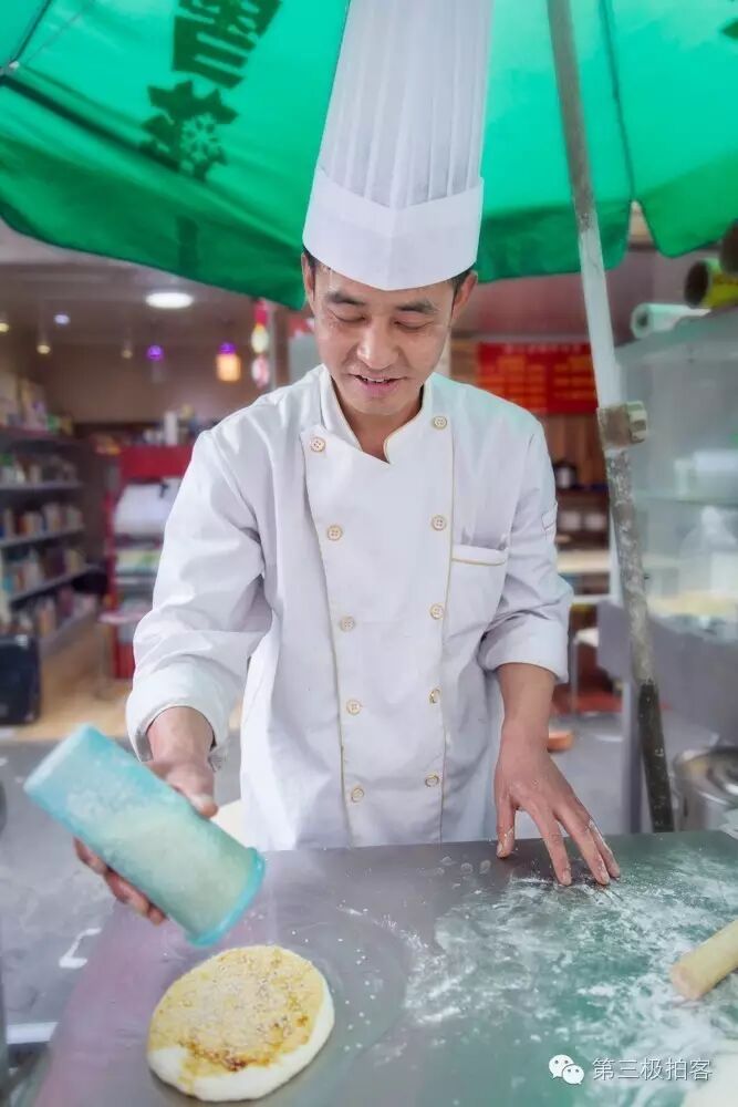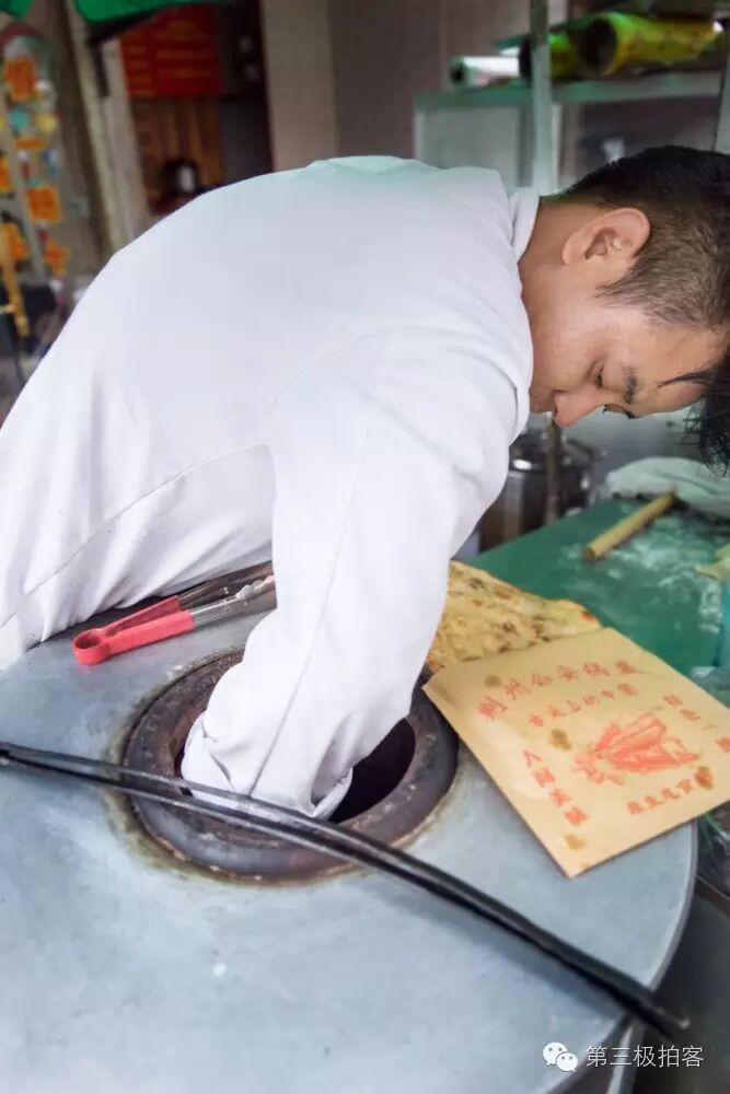 老板锅盔做得飞快,从揉面,到包馅儿,再到把包子变成馅饼,撒上芝麻,拍成长长的薄饼,放进炉灶,最后出锅,前后不到3分钟。老板说他原来在上海做锅盔的时候比这个还要快,也就不到一分钟的样子。
