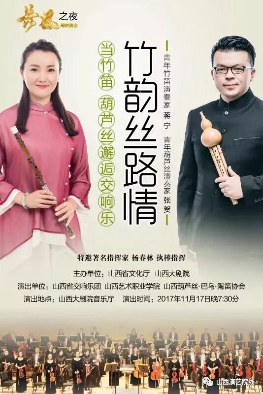 当竹笛与葫芦丝这两件极富特色的民族管乐器与交响乐邂逅,他们将会碰撞出怎样的火花?当两位当代知名青年民族管乐演奏家与著名指挥家携手,他们将会给到场嘉宾带来怎样的惊喜?请11月17日晚七点半走进山西大剧院音乐厅。我们与您相约,不见不散!