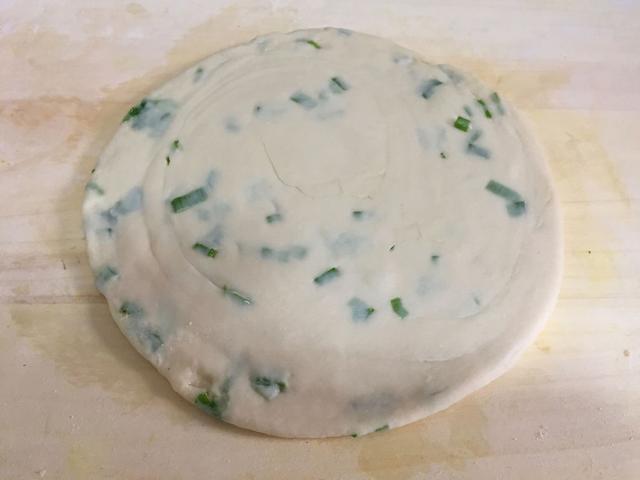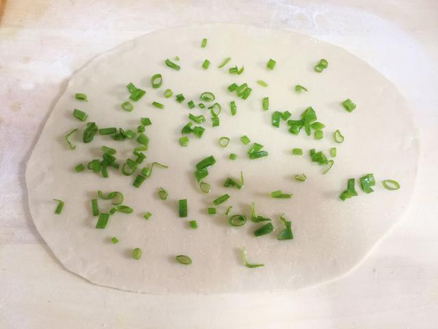 3. 把醒好的面团分成剂子。取其中一个剂子,擀开,刷一层油,撒上盐和香葱碎。