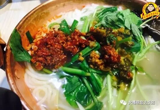 用小铜锅装的米线,老板说底汤是用猪蹄,鸡汤,还有骨汤熬制的,配菜有韭菜,鸡毛菜,还有一颗鸡蛋,加上肉酱,米线是细米线。还有云南的饮料,辣椒油,打开盖子就能闻到香香的味道。还有云南的酸角汁饮料,刚喝进嘴里有点甜滋滋,越来越酸,太酸了!大家去试试。