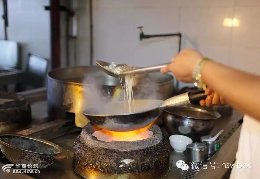 汤伴着碎馍煮沸后,师傅在锅里翻转,受热要均匀。
