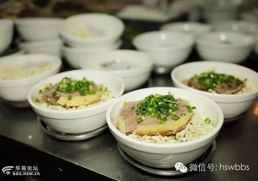 师傅盛好,端出灶台。还应注意的是:端上来的泡馍应是泡馍垫底,粉丝覆成网形,佐以葱花、香菜、牛羊肉摆成鱼形在最上面。