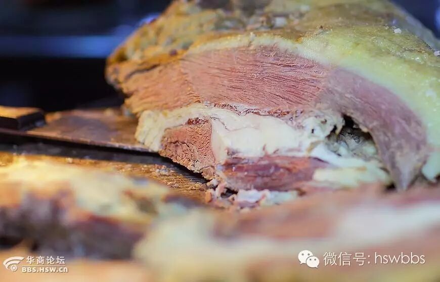 同盛祥第四代传承人乌平师傅。乌师傅讲述羊肉泡馍的历史和制作。一碗好的泡馍,首先须先有一锅煮制成的好汤,好汤的制法当然是商业秘密。而煮肉工艺也特别讲究,先要将牛羊肉反复漂洗,浸泡约5小时,切成约5斤重的大块,再把牛羊肉入锅,下旧调料袋提味儿,大火煮约4小时,肉块入锅,换新调料袋,加盖压实,旺火烧开后煮2至3小时改用文火炖约6小时,待汤浓肉烂,出锅上板备用。