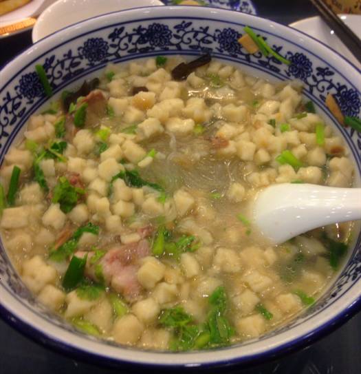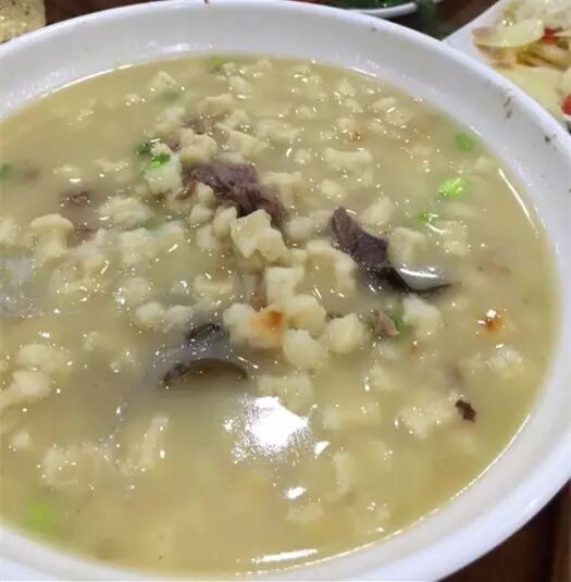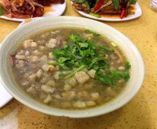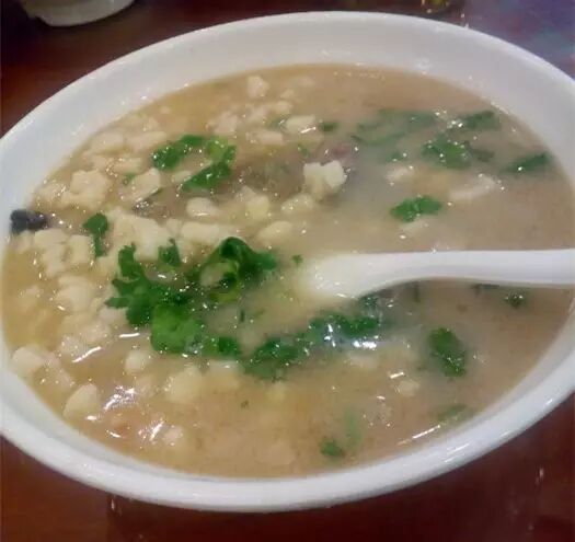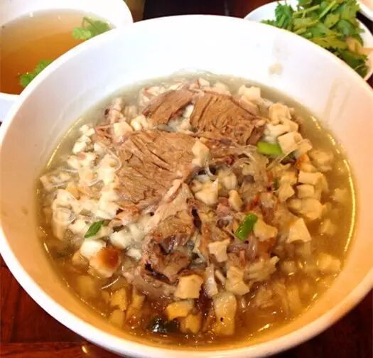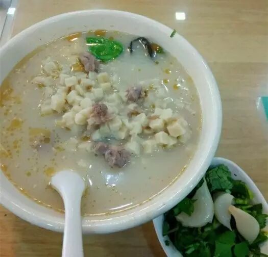 馍可以自己掰也可以要掰好的,味道相比来说会重一些,分量十足,汤比较宽,肉片也比较大,配着糖蒜吃,不腻人!