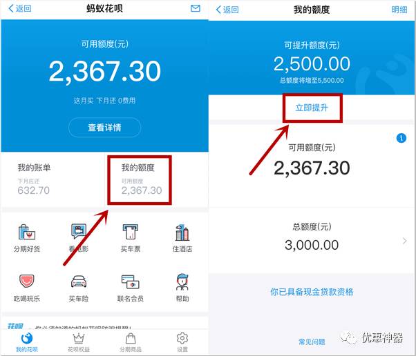 1、打开支付宝APP→找到蚂蚁花呗-查看我的额度-点击“立即提升”即可