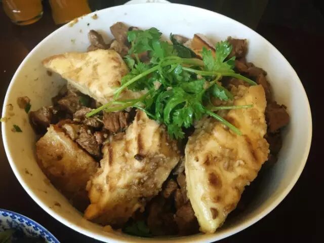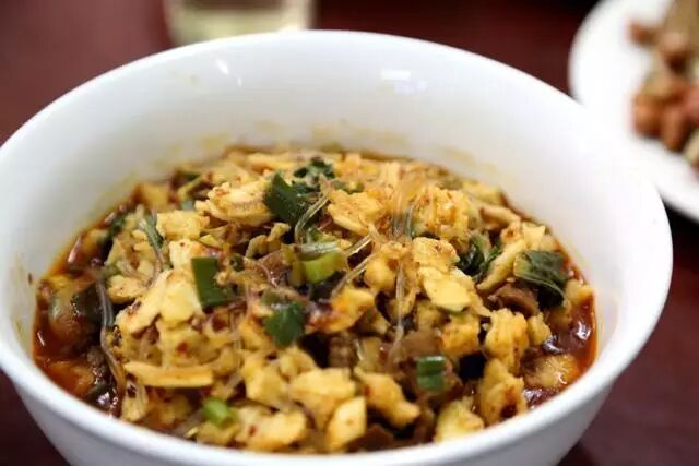 马洪家的小炒,里面配菜很丰富,有黄花菜、木耳、青菜、豆腐干、鸡蛋等配料,然后加上已切成小块的牛肉,直接用油泼辣子和醋一起炒制而成。吃到嘴里是酸酸辣辣,很开胃很爽口!
