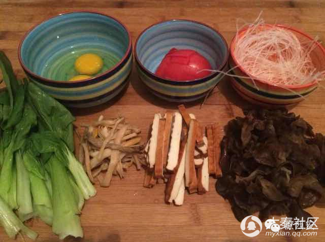 西红柿(1个) 豆腐干(2片) 干黄花(适量) 木耳(适量) 青菜(2棵) 粉丝(1把) 鸡蛋(1个) 花椒(适量)