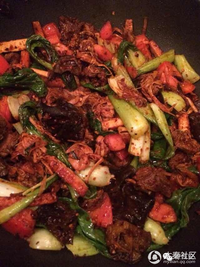 3、炒锅放油烧热下蒜苗后关小火,放辣椒面,根据个人口味酌情加啦。然后放豆腐干、木耳、黄花翻炒,然后下煮好的肉,最后放西红柿和青菜。(颜色有木有很漂酿