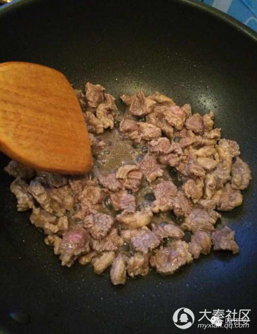 1、牛肋骨肉切小块,但不要太小,不然没口感。干锅下牛肉粒炒到干,放葱和姜翻炒加开水烧开撇去浮末,放酱油,调料包(花椒:小茴香=1:2)大火烧开,小火四十分钟后加盐,汤和肉就OK啦!