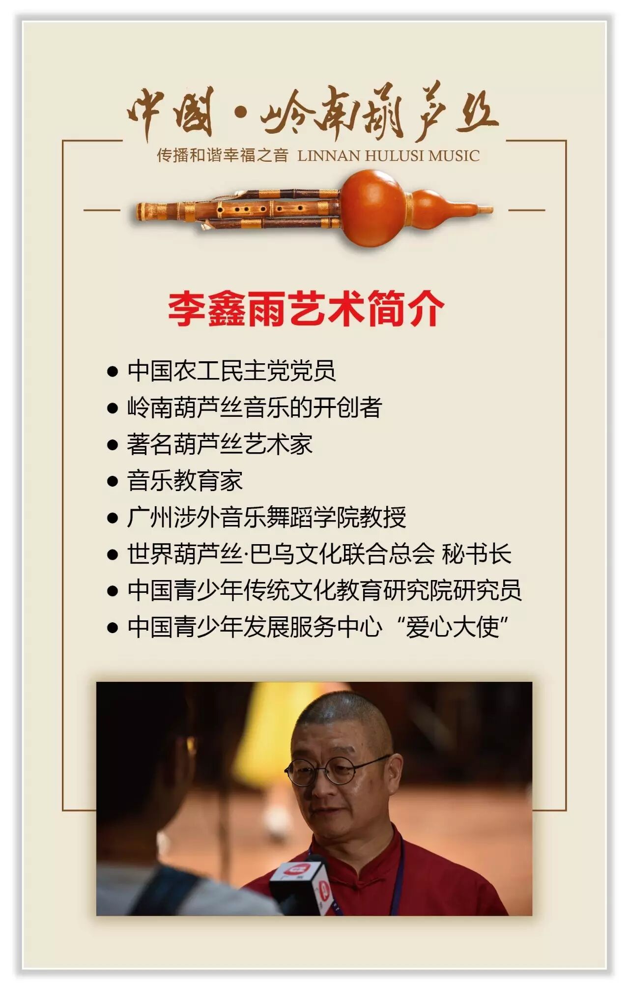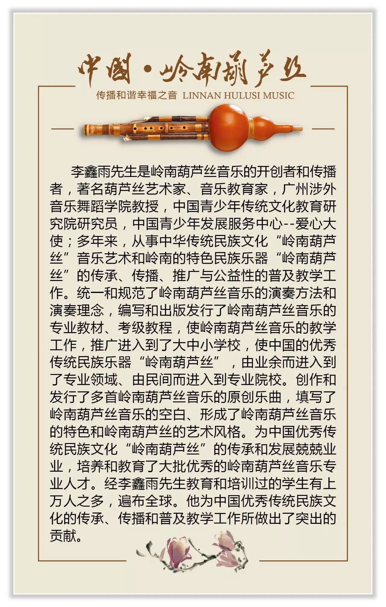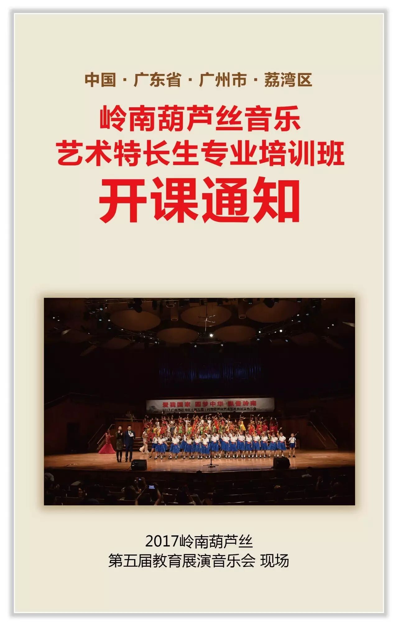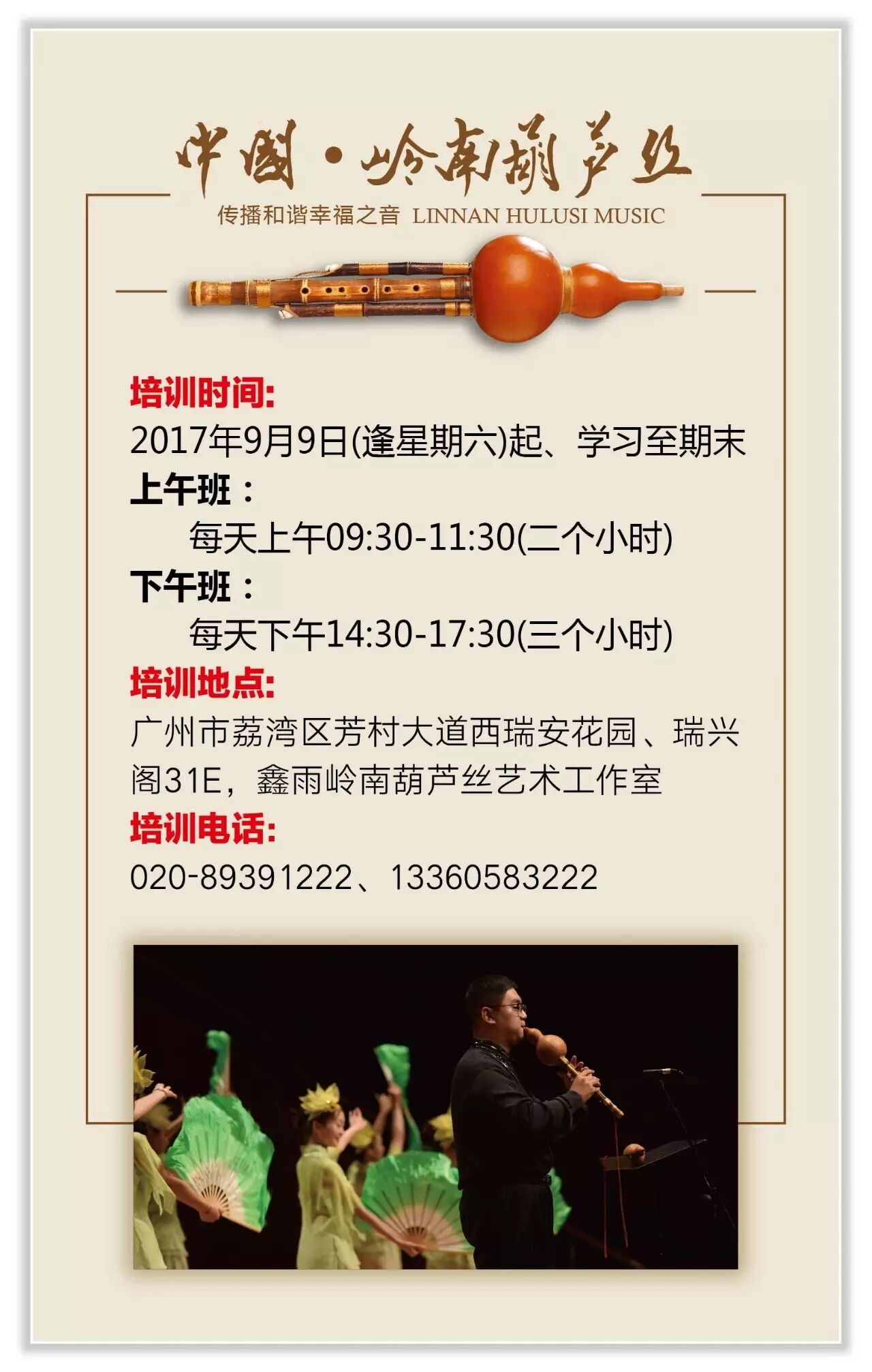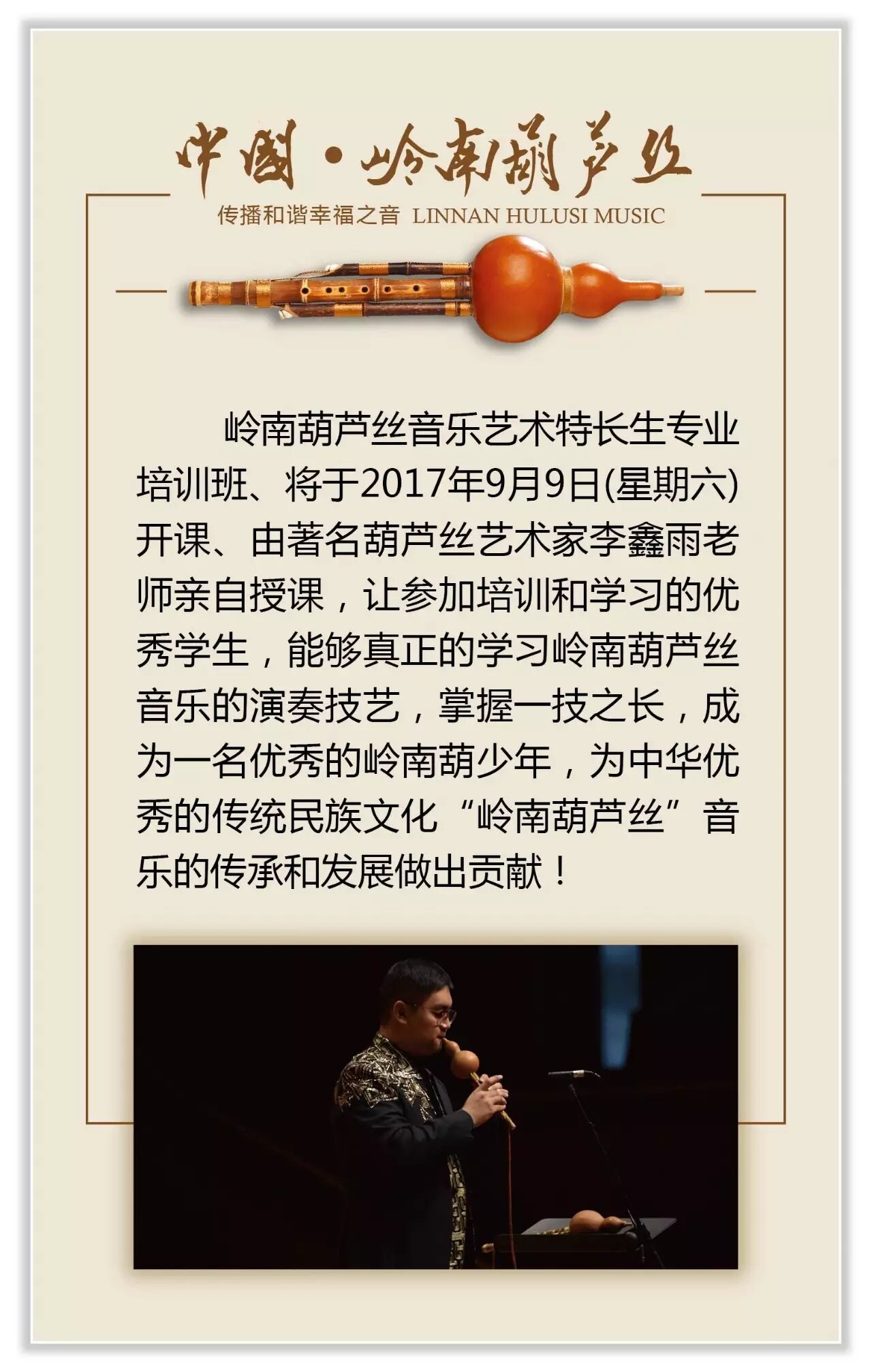 岭南葫芦丝音乐艺术特长生专业培训班、将于2017年9月9日(星期六)开课、由著名葫芦丝艺术家李鑫雨老师亲自授课,让参加培训和学习的优秀学生,能够真正的学习岭南葫芦丝音乐的演奏技艺,掌握一技之长,成为一名优秀的岭南葫少年,为中华优秀的传统民族文化“岭南葫芦丝”音乐的传承和发展做出贡献!