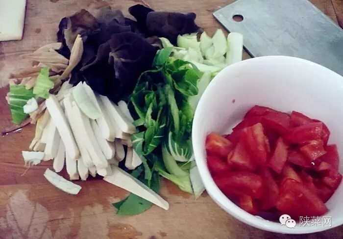 西红柿1个、豆腐干2片、鸡蛋1个、青菜2棵,干黄花、木耳、粉丝各适量,盐、酱油、辣椒面、醋、生姜、葱、花椒、小茴香各适量,干酵母适量。