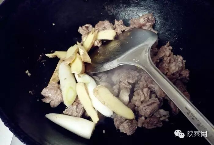 2、炒锅中不要放油,放入切成麻将块大小的牛肉大火煸炒(炒出血水)。待血水出干净后,放入葱、姜,炒出香味。