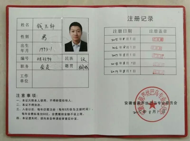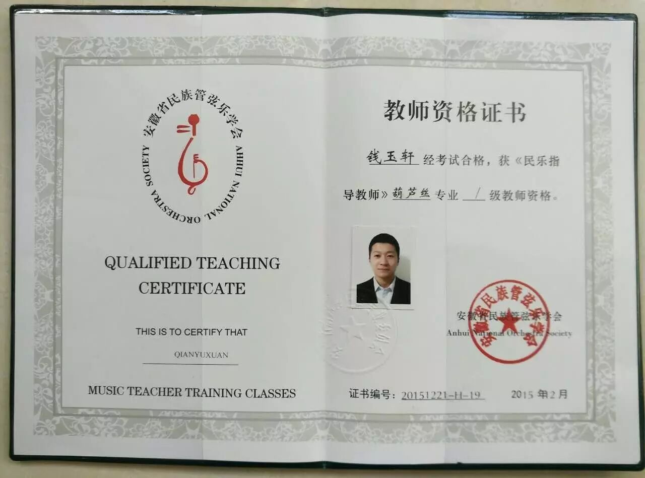 钱玉轩,男,1993年生。本科学历,毕业于合肥师范学院音乐系,现为中国管弦乐学会葫芦丝巴乌专业委员会会员、安徽省葫芦丝巴乌专业委员会会员、桐城市音乐家协会会员、桐城市文化馆和老年大学特聘葫芦丝教师。