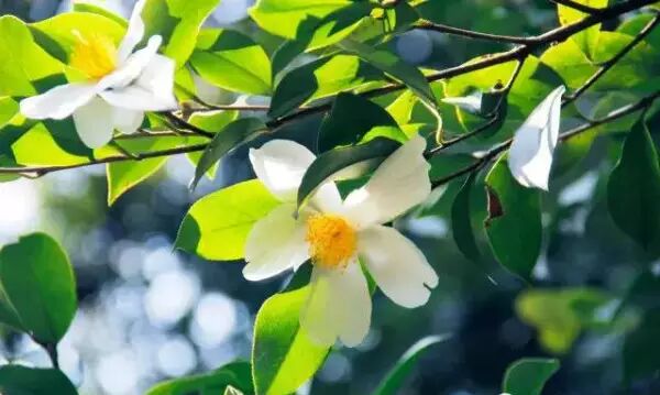 白花油茶的花朵,独有一份温婉可人、淡雅清新的别致,小小的一朵,缀满枝头,摇曳生姿,香气袭人。