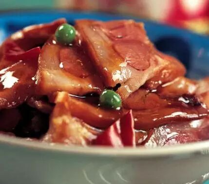 2.锅内放油,烧热,加蒜片、郫县豆瓣爆香,放入猪头肉、笋片、辣椒、青豆、酱油煸炒,加糖、味精后淋上红油即可。