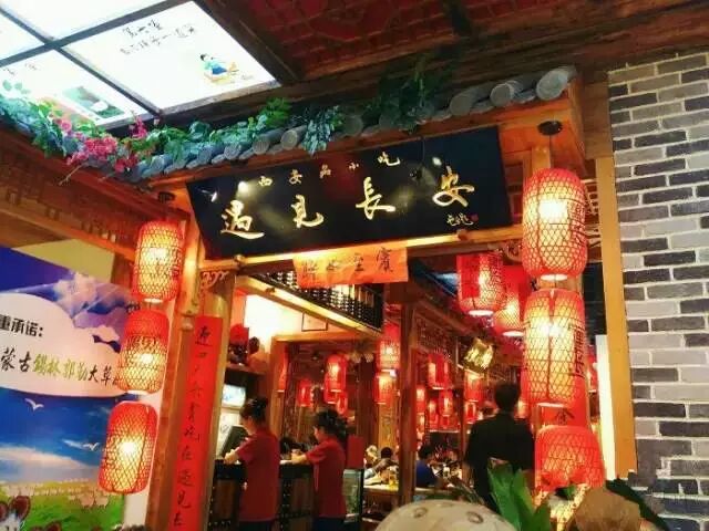 位于高新区唐延路3号卜蜂莲花二层,店名遇见长安非常醒目,长长的几串红灯笼挂在门前,往里走看见墙面的木板上写着“大秦美食”,还有剪纸,配上木椅木凳,像一个开在楼上的农家乐。