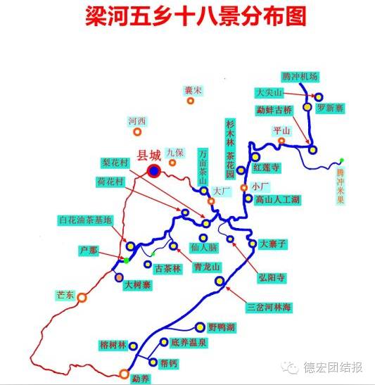 野鸭湖、青龙山、仙人脑、梨花村、罗新寨、勐蚌古桥、红莲寺、万亩杉木林、油竹坝水库、樱桃园、弘阳寺、三岔河林海、万亩茶山、千年古茶林、白花油茶基地、大树寨、帮盖村、榕树林如同一颗颗璀璨的珍珠洒落在风景如画的东山梁子及河谷地带,共同构成了梁河县的“五乡十八景”。
