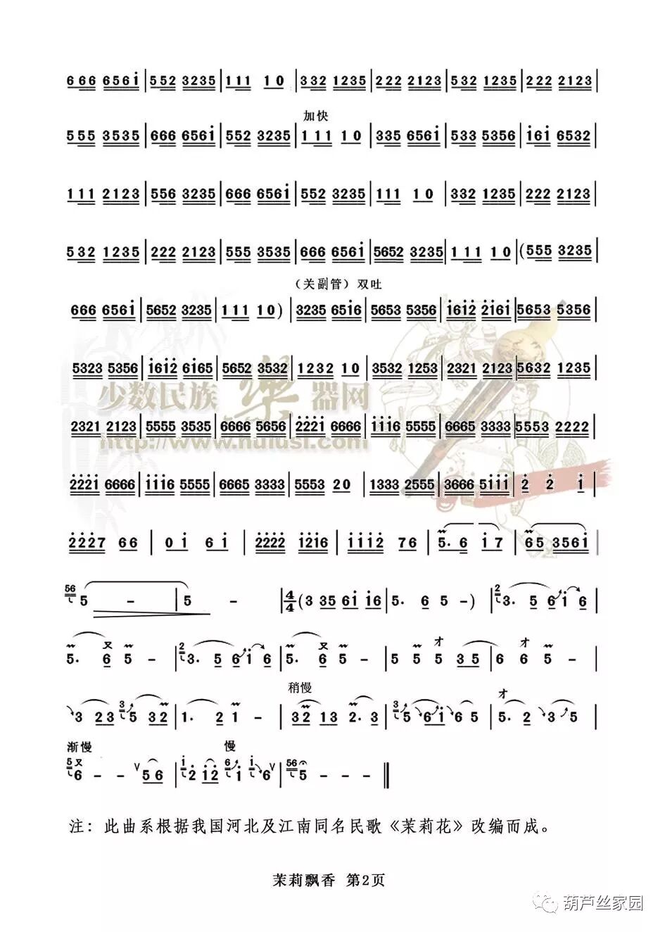 小溪(赵学贵)和雅客(王玉亭)两位老师合作改编的葫芦丝独奏曲目《茉莉飘香》,将自古至今广为咏唱的“好一朵美丽的茉莉花”以葫芦丝独奏的形式演绎出来,同时融入了河北民歌《茉莉花》的旋律。——张晓峰葫芦丝《茉莉飘香》音频