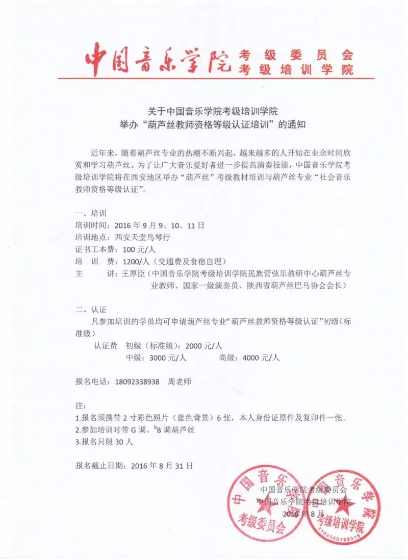 关于中国音乐学院考级培训学院在西安举办“葫芦丝教师资格等级认证培训”通知