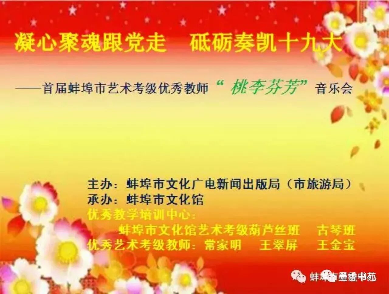 为了更加广泛深入的学习宣传贯彻党的十九大精神,凝心聚气,合力共筑中国梦,蚌埠市文化广电新闻出版局(市旅游局)以人民群众喜闻乐见的方式主办 、蚌埠市文化馆承办的“凝心聚魂跟党走 砥砺奏凯十九大”——首届蚌埠市艺术考级优秀教师“ 桃李芬芳”音乐会。