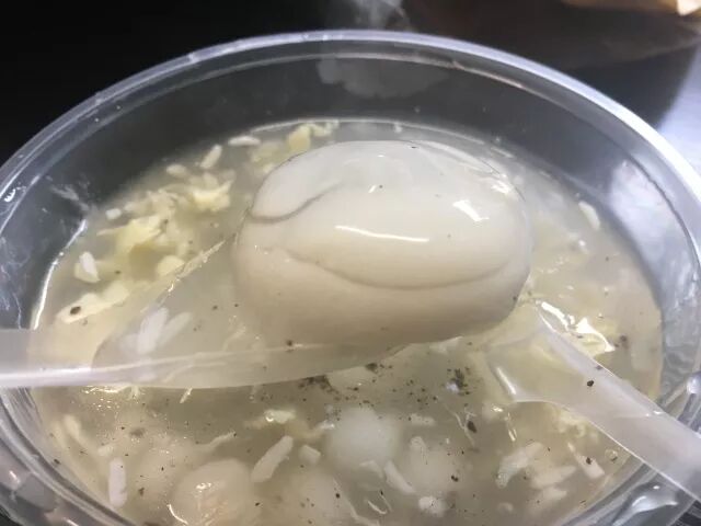 米酒糊浓稠得恰到好处,不会太甜,里面既有糯米小丸子,也有黑芝麻汤圆,黑芝麻馅很香,糯米皮不会像速冻的那样外软内硬,配上蛋花,暖暖的,很舒服。