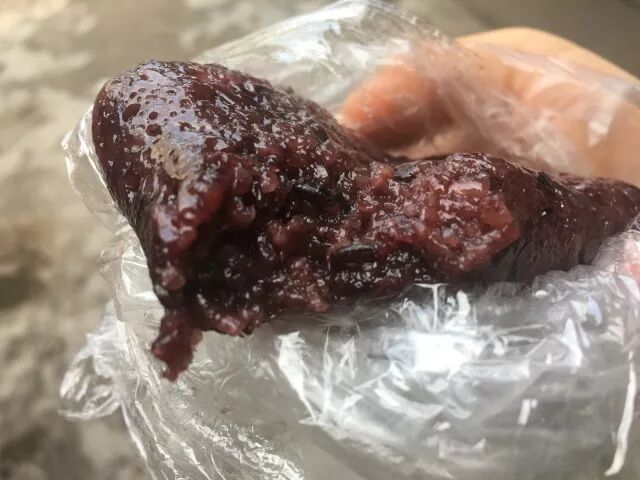 塑料皮包裹着大大一块紫糯米,紫糯米的香气在高温的烘托下更加浓郁,吃起来很有嚼劲,紫糯米的颗粒很饱满,又香又甜又弹牙。入口竟有种淡淡的奶油味道,赞!