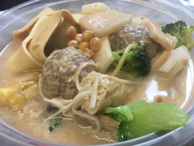 推荐:紫薯丸子的外面是QQ弹弹的糯米粒,里面是紫薯泥,吃起来非常有质感,紫薯丸子本身口感偏甜,浸透汤汁后,糯米的口感更加饱满,不过,吃多了也会有点儿腻,一个足矣;咬一口腐竹下去,便有汤汁渗出,刚好的咸味配上刚好的滑嫩;