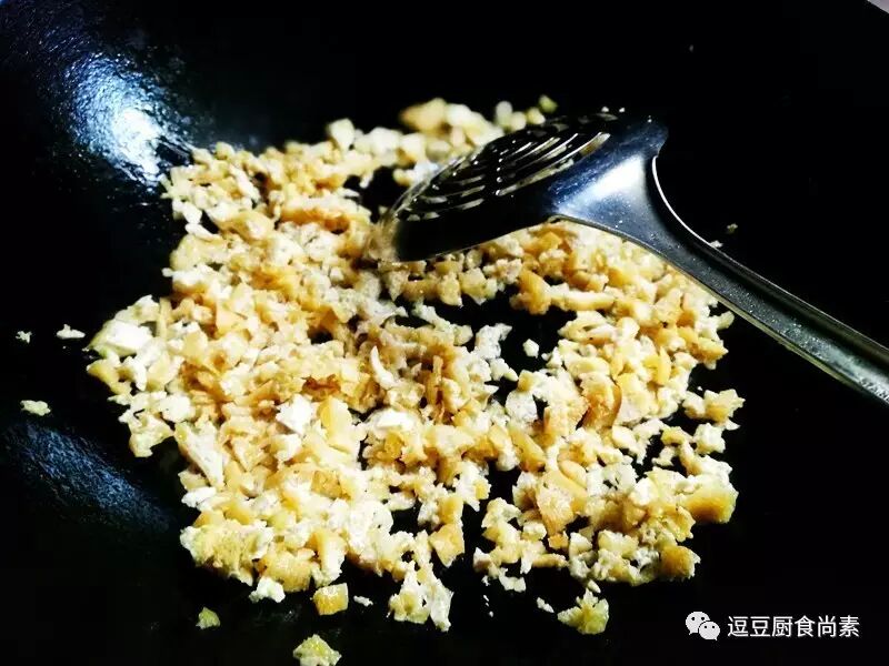 2.锅内放油,将油豆泡切碎上锅炒,炒黄。
