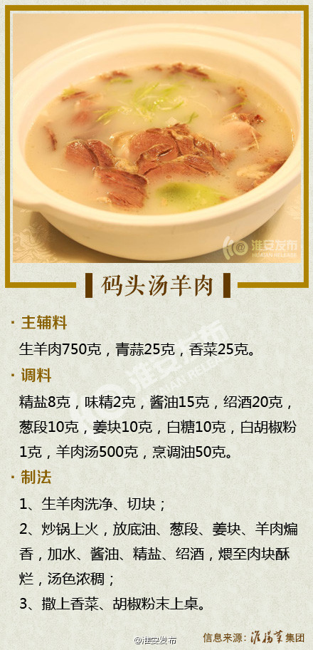 【码头汤羊肉】与北京的涮羊肉、新疆的烤羊肉、西安的羊肉泡馍一起,被世人称为“羊肉四绝”,为冬令食补之佳品,具有补中益气、壮阳益肾、补益虚寒之功,尤其对冬季产妇术后大虚、心腹绞痛等症状有明显治疗作用。