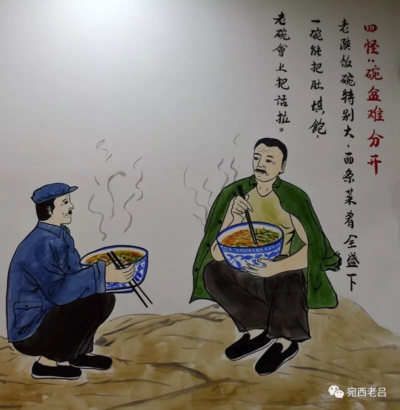以面食为主的关中农村体力劳动者,饭量比较大,特别是被称为“外头家”的男人,饭量就更好了。乡下男人吃饭不爱在家里坐,而是喜欢端着大碗,在家门口圪蹴着凑堆边吃边聊。大碗有个好处,盛一次是一次,省去了再盛饭的麻烦。
