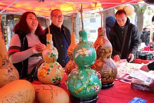 记者在现场看到,道路两旁的每个摊位面前都站满了人,询问葫芦的工艺、价格等。山西展位上的溢彩錾花葫芦气势磅礴、优雅高贵,河北展位上的烙画葫芦择料精良、造型成熟,天津展位上的镂空葫芦工艺精湛、纹样华美;被誉为“中国葫芦之乡”的聊城堂邑镇葫芦茶叶罐、香筒等稳重大气,上面的烙画精细工整、美观大方。除此以外,此次展区内还有核桃雕刻、根雕、木雕等艺术品。