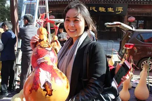“我是从烟台招远过来的,这是我自己烙画的葫芦。”来自招远某高职学校的美术老师周莉拿出了自己的作品“钟馗纳福”,“烙画是我们的业余爱好,待会儿我跟同伴还要去采购一些适合作画的葫芦。我觉得开办这种文化艺术节很有意义,我们每年都来。”