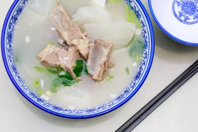 成块成块的羊排熬到透白,萝卜晶莹,点点芹菜才卧在上面。整碗羊汤看起来很是清新。