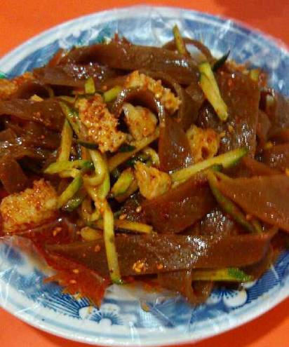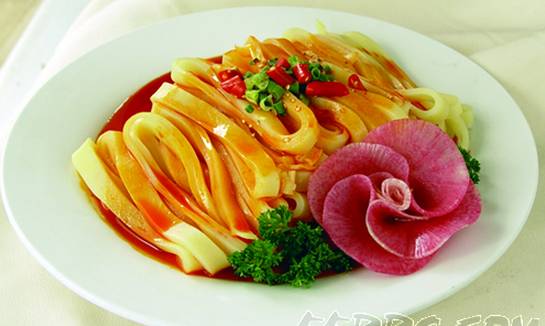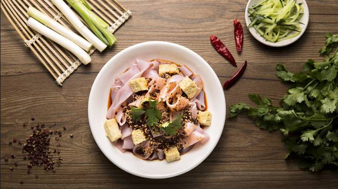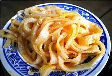 忒色:厚版的擀面皮,口感劲道。调上醋、辣油、面筋等拌起来。
