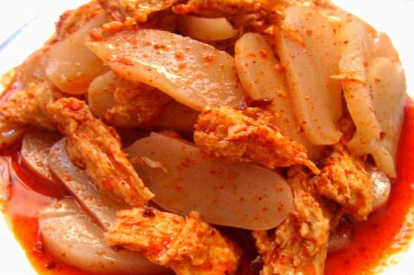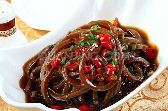 4、取出放入凉水冷却,慢慢的揭下来,尽量不要撕破,等凉了,切条调味