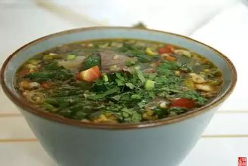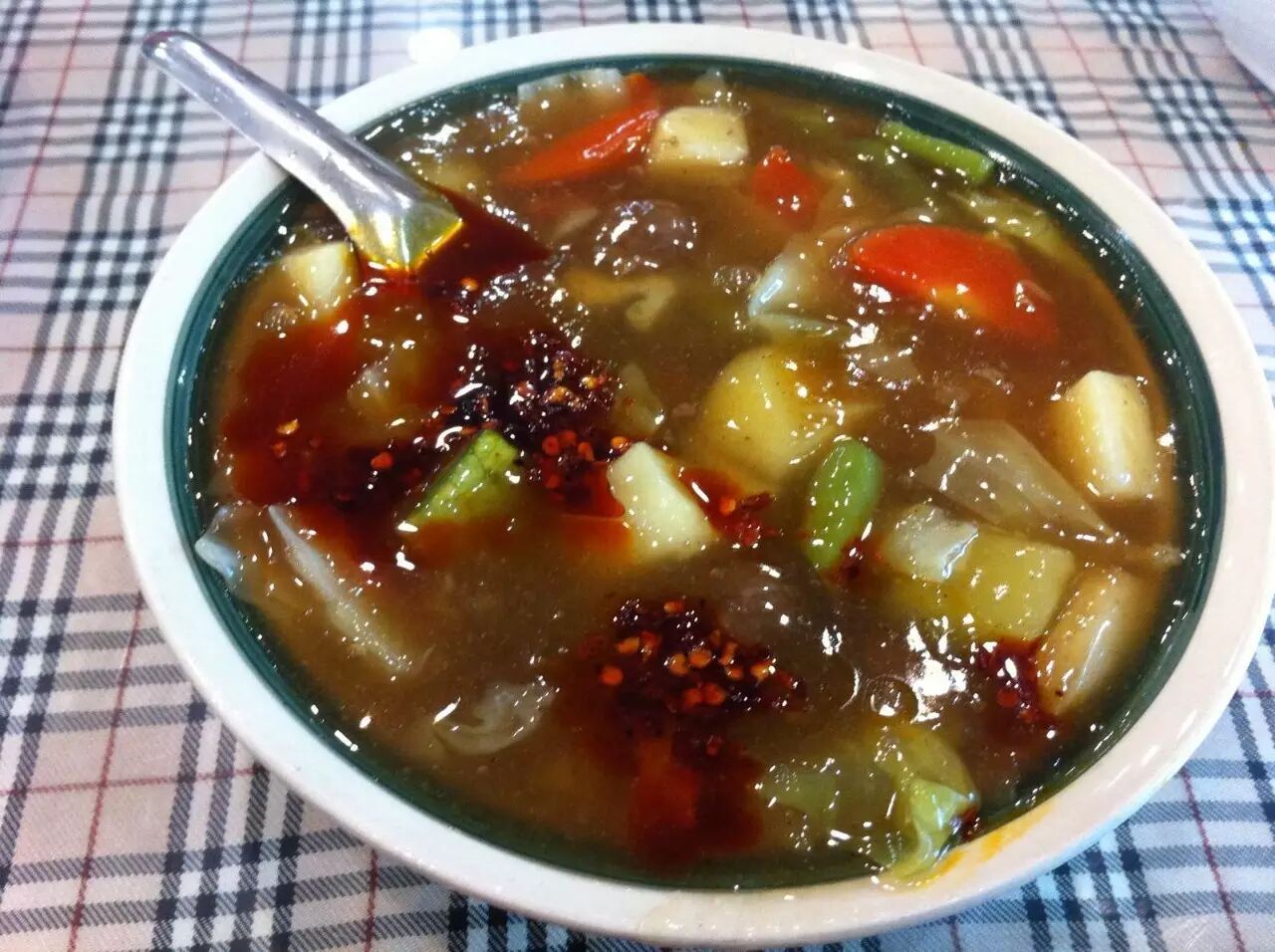 杂烩汤,以牛肉、粉条、豆腐、丸子、菠菜……等原料制作而成,味道比较“汆”,以酸、辣为主。
