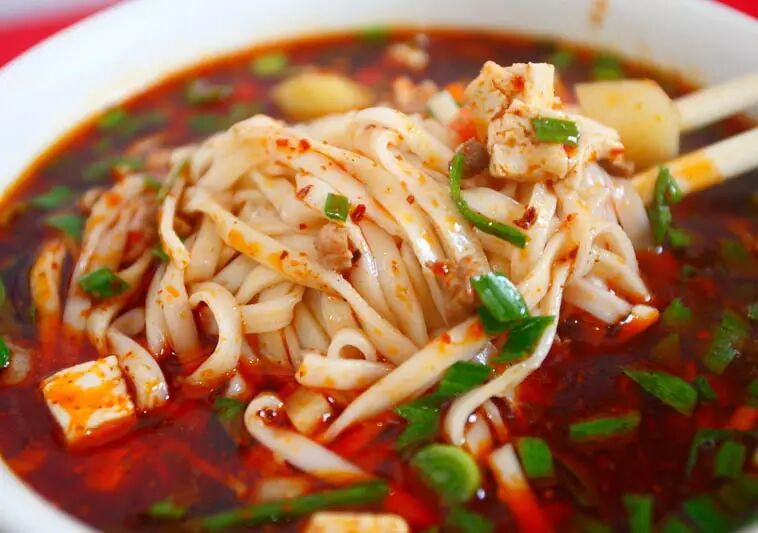 陕西-臊子面◆ 臊子面是陕西风味小吃,品种多达数十种,关中农村地区,新年第一天的早晨基本都是臊子面。吃饭前,先端一碗汤去门前撒一些以祭奠先人和土地爷、仓神、灶神等,后才家人享用。有的也在先人像前献上在碗臊子面以示怀念。