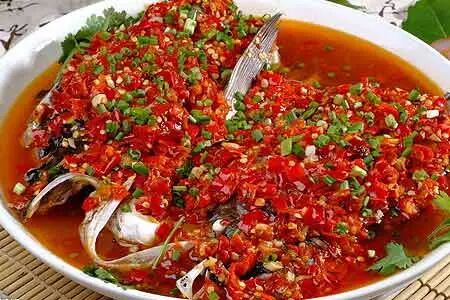 ◆ 剁椒鱼头属湘菜系,是湘潭的一道名菜。以鱼头的"味鲜"和剁辣椒的"辣"为一体,风味独具一格。特别指出的是此菜所使用的油是茶油。湖南湘潭的剁椒鱼头是在大街小巷的大小餐馆酒店都可以吃到的。