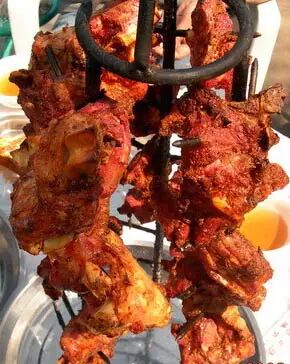◆ 架子肉是一种味美的肉食品。架子肉多选择当年羯羊或周岁以内的羊。做法是把羊羔宰杀后,去其皮和内脏,将肉分为若干块,洗净后用面粉鸡蛋包裹起来,并放洋葱、胡椒等佐料,然后放入密封的馕坑中烘烤。架子肉鲜嫩而可口,是待客的上品。