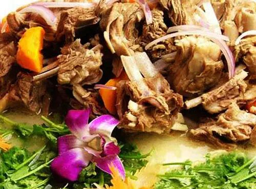 ◆ 从哈萨克民族中传来的一种羊肉食用法,因用手抓吃,故得名。做法较简单,即先将带骨的羊肉剁成块,放入清水中煮熟,捞出后上面撒上洋葱末、盐、再浇点滚汤即成。这种肉味道清纯软嫩,油香不腻,既可吃肉,又可喝汤,是本地人招待来客的美食。特别用小羊肉煮出的,谓之"羊羔肉",其美味则更具上乘。