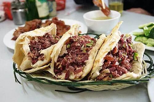 ◆ 俗话说,天上龙肉,地下驴肉。由此可见驴肉的地位之高。平常看到的大概很多的驴肉火烧都很山寨、有的甚至拿白吉馍和馅饼来代替驴火的尊容。走在河北省的各大城市区县街头经常见到的就是河间驴肉火烧,最正宗的驴火经过慢火细炖加上师傅们的配料,然后将烧饼一分为二,把驴肉切片和作料夹起来,走在任何地方都会找到,要吃正宗驴火,还是亲自来河北保定一趟吧。