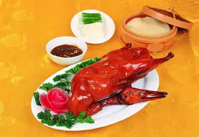 ◆ 北京烤鸭是正宗的京派口味。全聚德烤鸭颜色呈枣红色,光亮油润,皮层酥脆,外焦里嫩。大厨现场展示刀功,会将鸭肉切成薄薄的片儿,每一片有皮有肉有油。通常的是吃法是在春卷上抹上一层甜面酱,加上大葱段,把鸭肉片卷进去,吃到嘴里,皮是酥的,肉是嫩的,最为鲜美。全聚德烤鸭价格适中,一鸭二吃也很有特色,非常适合家庭聚会和商务宴请。