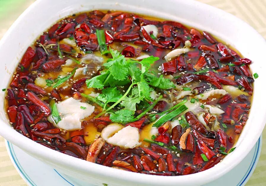 ◆"水煮鱼",又称"江水煮江鱼",系重庆渝北风味。看似原始的做法,实际做工考究--选新鲜生猛活鱼,又充分发挥辣椒御寒、益气养血功效,烹调出来的肉质一点也不会变韧,口感滑嫩,油而不腻。既去除了鱼的腥味,又保持了鱼的鲜嫩。满目的辣椒红亮养眼,辣而不燥,麻而不苦。"麻上头,辣过瘾",让水煮鱼在全国流行得一塌糊涂。